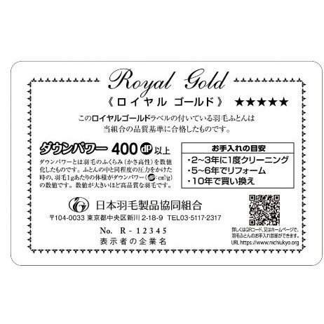 日本羽毛製品協同組合ロイヤルゴールドラベル認定のフランス産羽毛を使用しております。