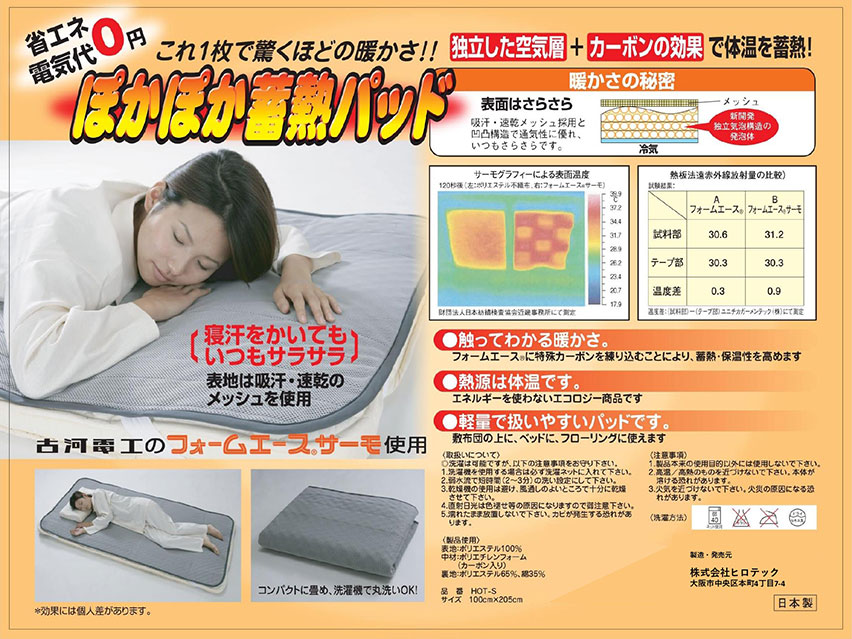 電気を使わない、自分の体温を熱源として体温を多層構造のポリエチレンフォームに蓄積する、あったか敷パッドです。