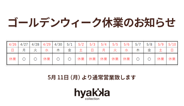 誠に勝手ながら4月26日・29日、5月2~6日・9~10日までお休みとさせていただきます。