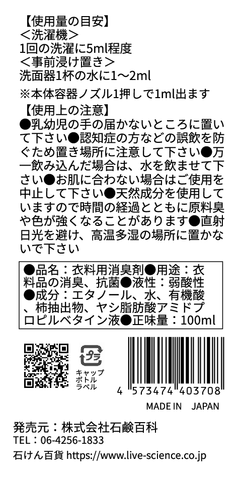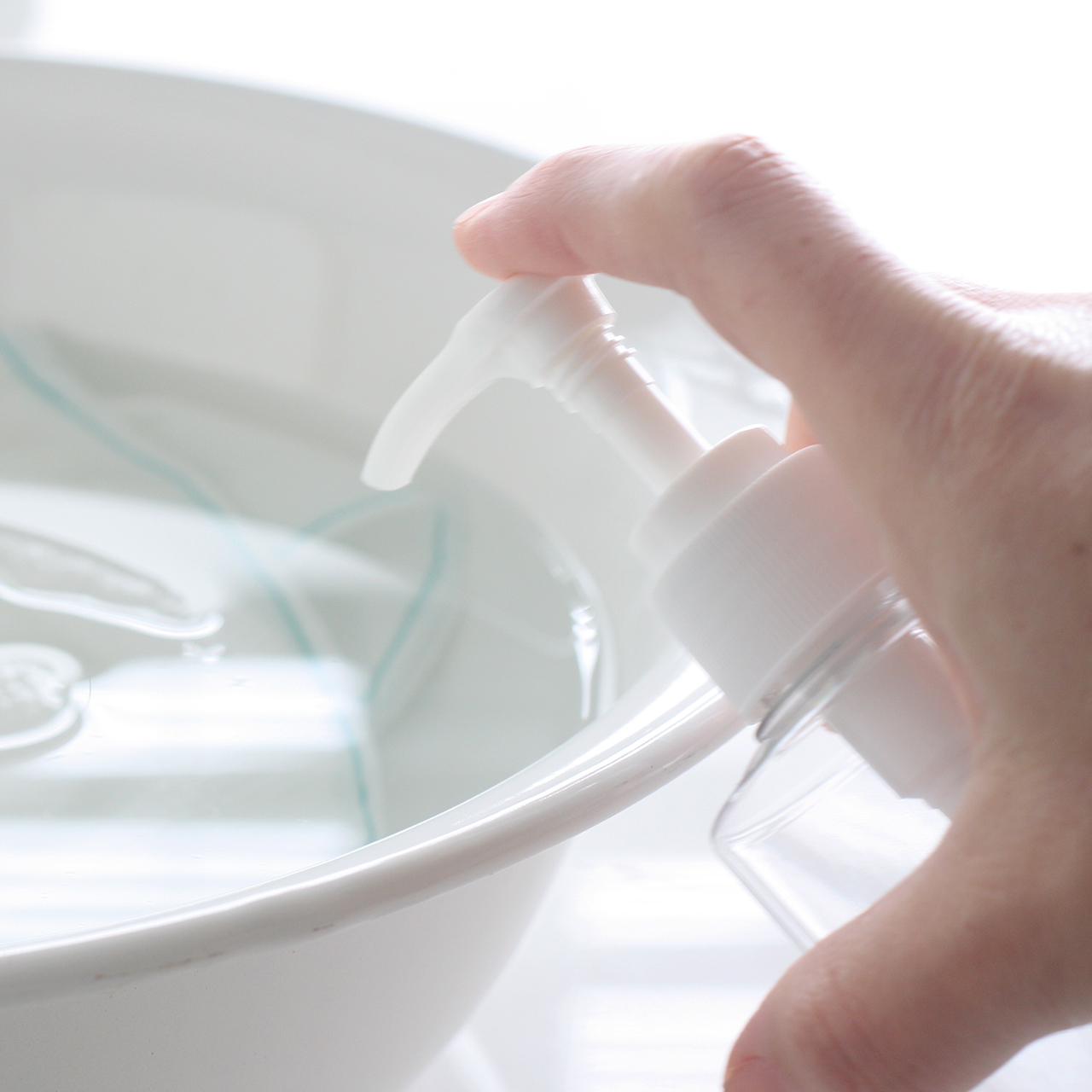 使用量の目安:洗濯機:1回の洗濯に5ml程度、事前浸け置き:洗面器1杯の水に1~2ml