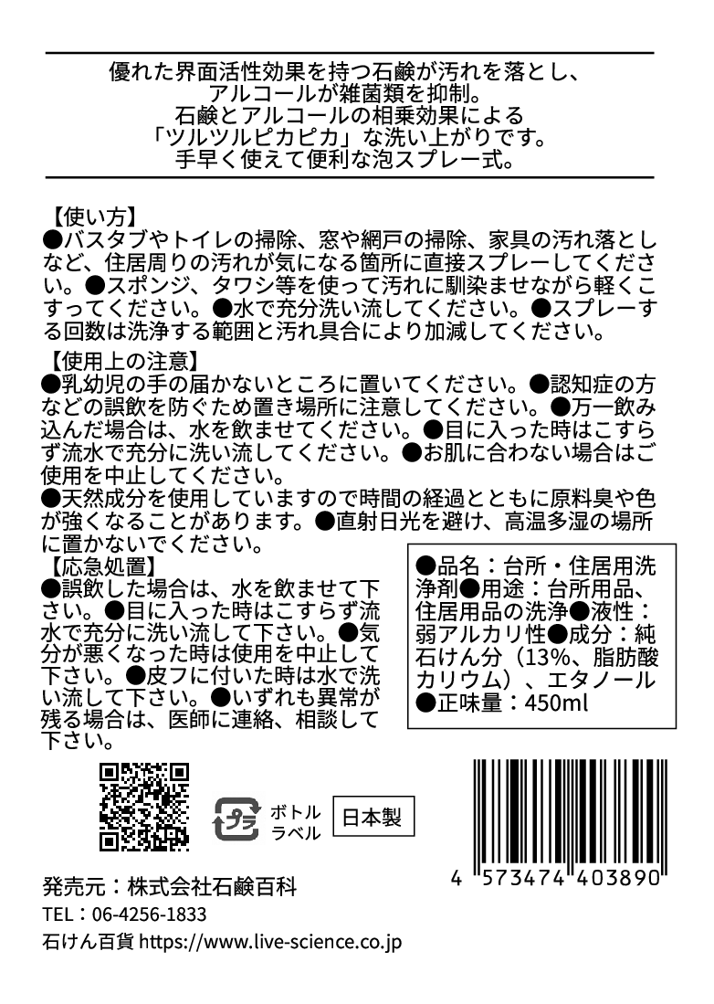 優れた界面活性効果を持つ石鹸が汚れを落とし、アルコールが雑菌類を抑制。石鹸とアルコールの相乗効果による「ツルツルピカピカ」な洗い上がりです。