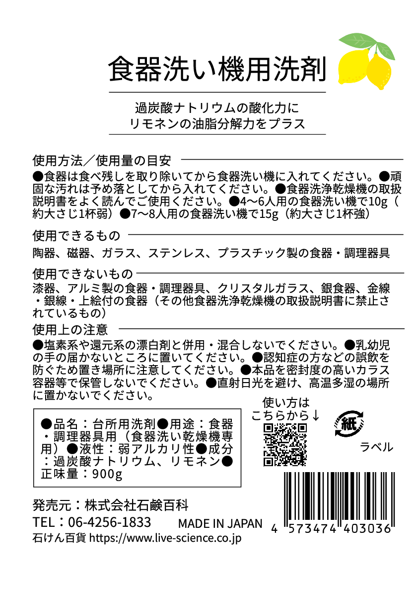 【送料お得セット】食器洗い機用洗剤 <リモネン> 900g (4袋セット)
