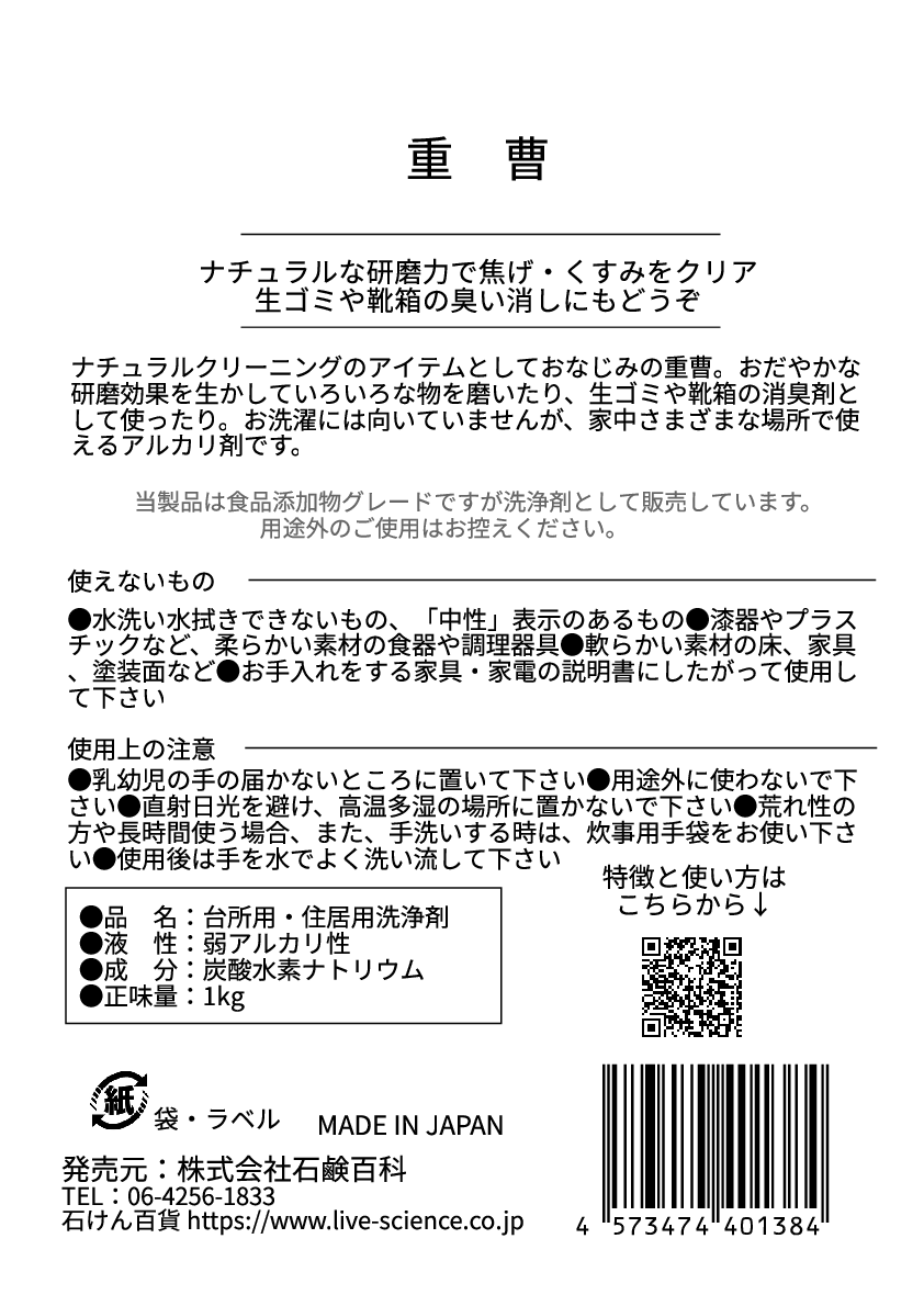 食品添加物(ふくらし粉など)や医薬品(胃薬など)として古くから利用されてきたアルカリ剤です。常温では安定しており、長期保存が可能。水溶液はpH8.2(2%、20℃)のごく弱いアルカリ性を示します。粒子が細かく、水に溶けにくいためクレンザーとして使えます。加熱すると激しく炭酸ガスを出すので、調理器具の焦げ付き落としにも役立ちます。