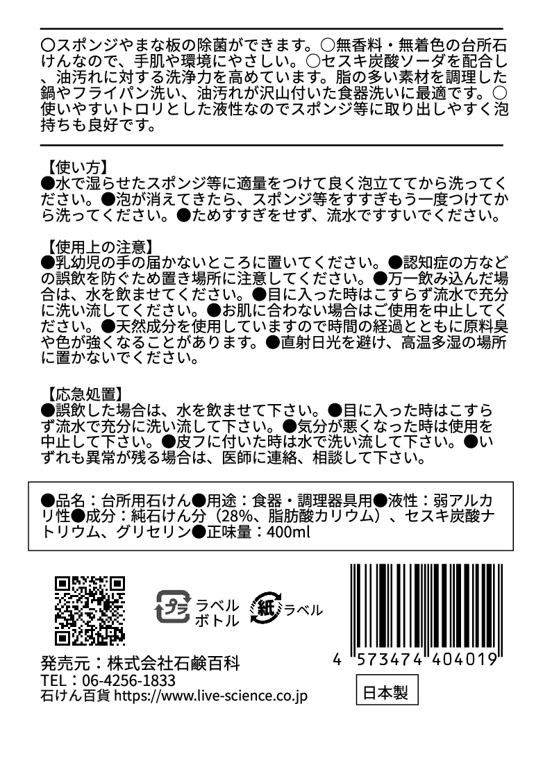 無香料・無着色の台所用液体石鹸です。(ちょっときつい炭酸塩ではなく)手肌にやさしいセスキ炭酸ソーダを配合することで、油汚れに対する洗浄力を高めています。