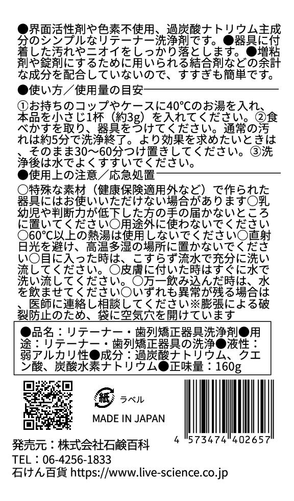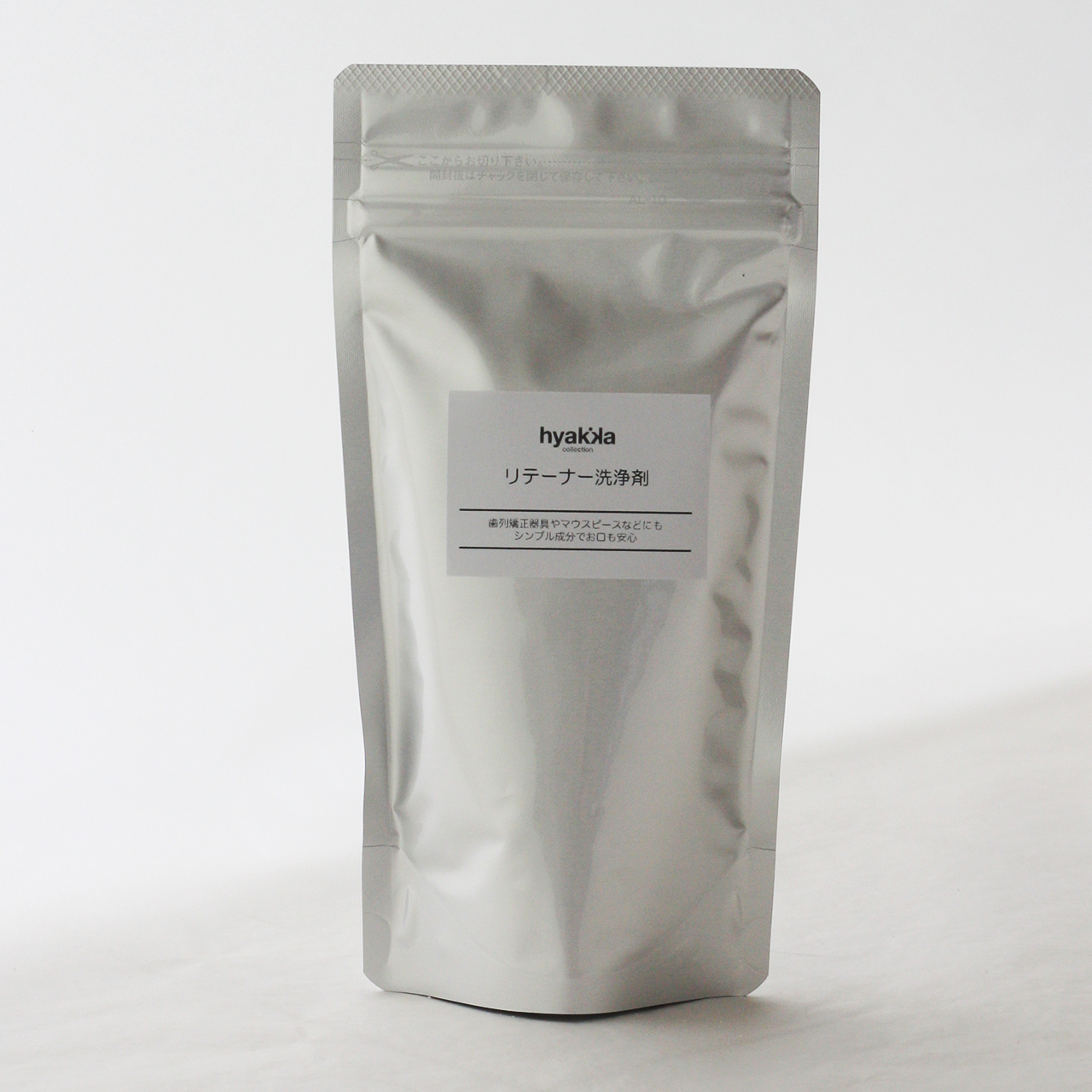 「リテーナーやマウスピース、歯列矯正器具の洗浄剤には『石けん百貨 入れ歯洗浄剤』を!」とお勧めし、その後、たくさんの商品レビューとともに、名称を変えて販売してほしいという要望をたくさんいただいての、商品化です。大変お待たせしました。また、ご要望をありがとうございました。