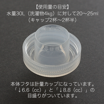 ※本体フタは計量カップになっています(杯で10ml)。「↓6.6」と「↓8.8」の目盛りがついています。