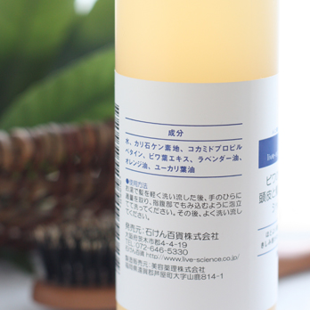 全成分:水、カリ石ケン素地、コカミドプロピルベタイン、ビワ葉エキス、ラベンダー油、オレンジ油、ユーカリ葉油