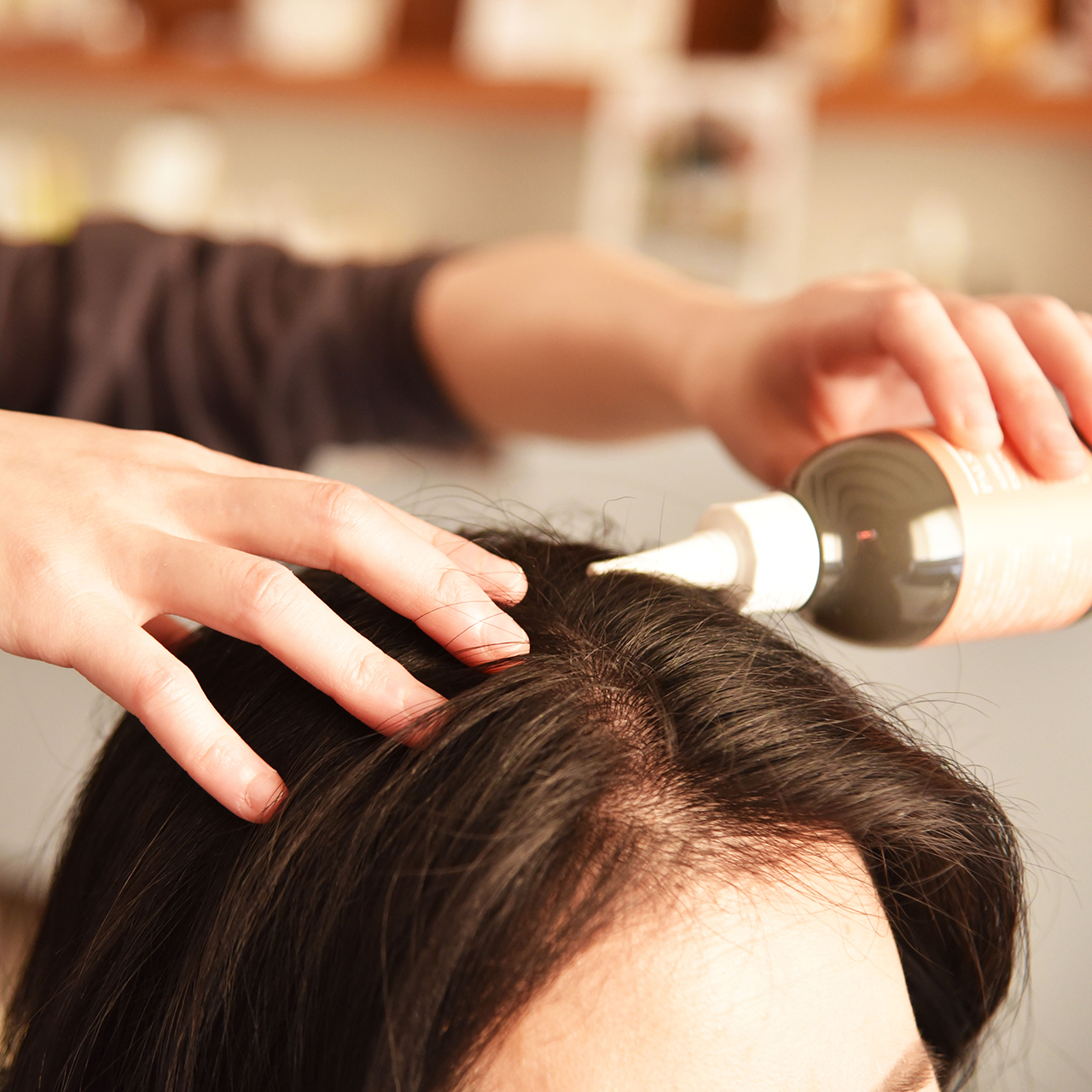 髪を乾かした後やスタイリングの前に、ノズルを頭皮の直接つけて、頭皮全体に指の腹で揉みこむように馴染ませてください。
