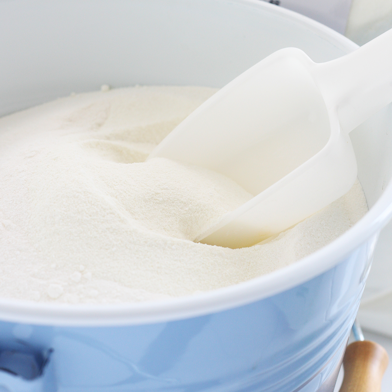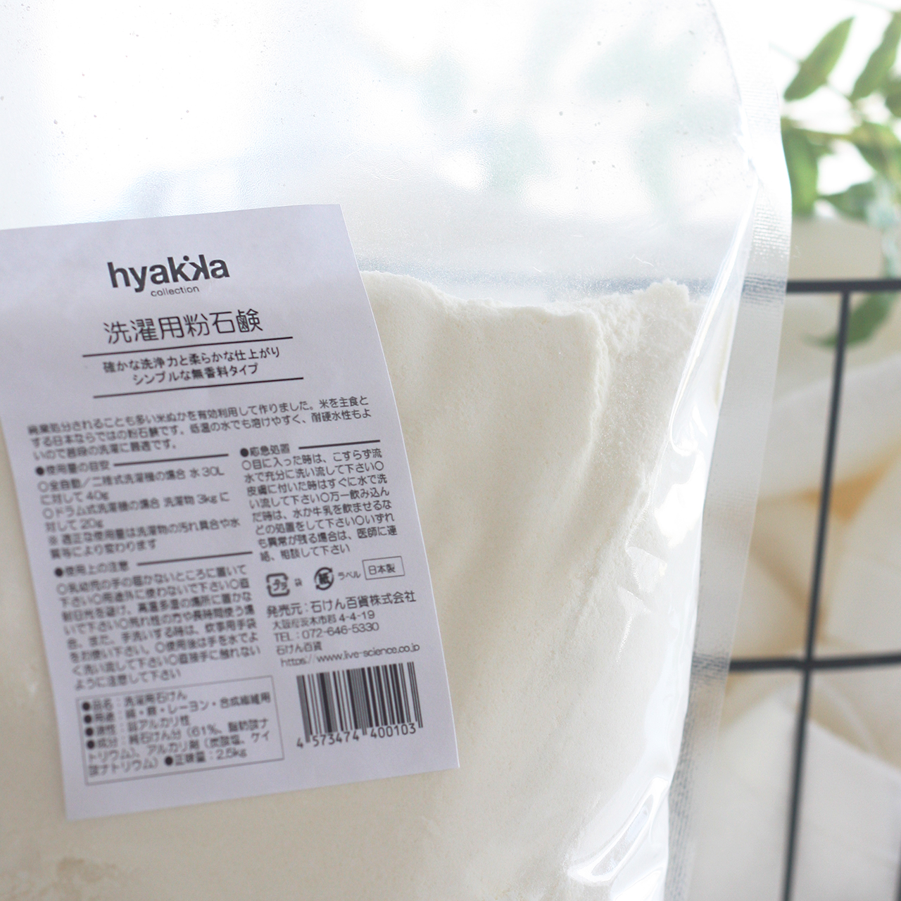耐硬水性のよい米ぬか油を主原料にした粉石鹸に、さらに水軟化作用のあるケイ酸ナトリウムも配合。石鹸の洗浄力が水のミネラル分に奪われることを軽減します。従来の粉石鹸に比べ2~3割少ない使用量でもしっかり泡立ちます。