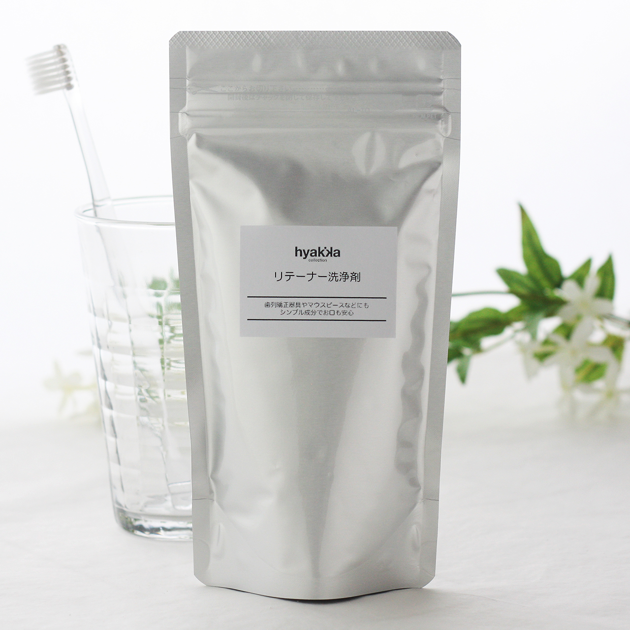 歯列矯正器具・リテーナー・マウスピース・入れ歯などの洗浄剤です。主成分は過炭酸ナトリウム。界面活性剤や色素、増粘剤や結着剤などは不使用。量を調節しやすい顆粒タイプ。