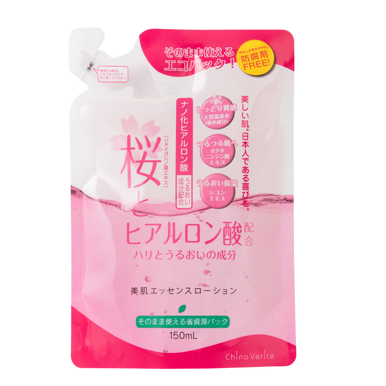 潤いある桜をイメージしたエッセンスローションです。ハリとうるおいの成分として、ナノ化ヒアルロン酸を配合。角質層へしっかり浸透します。詰め替え不要の省資源パックを採用。